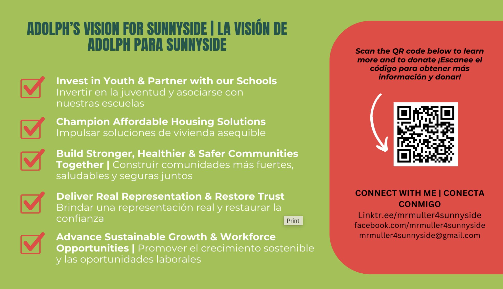 I’m not backed by big donors — I’m backed by neighbors who believe in our community. If you share that belief, please consider donating today. Let’s build a Sunnyside we can all be proud of.